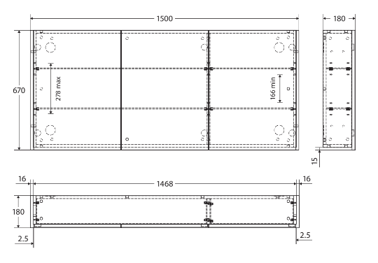 Width: 1500mm x Height: 670mm x Depth: 180mm